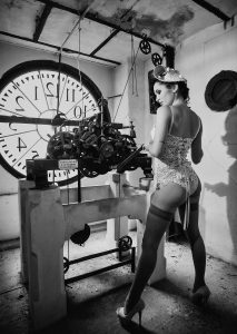 Sesión boudoir realizada en el interior del antiguo reloj del edificio Las 3 Campanas, un espacio industrial con engranajes originales y luz natural filtrada. La propuesta creativa combina fotografía de moda, retrato editorial y una estética inspirada en Helmut Newton, buscando imágenes elegantes, tensas y con un punto provocador.